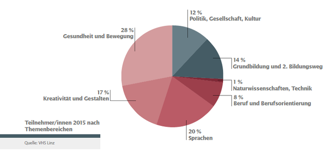 2015 nahmen rund 24.000 Teilnehmer/innen (davon etwa zwei Drittel weiblich) das Kursangebot der VHS Linz in Anspruch – Tendenz steigend. Besonders beliebt sind die Bereiche Gesundheit und Sprachen – hier werden vor allem die Angebote im Bereich „Deutsch als Fremdsprache“ nachgefragt: